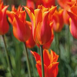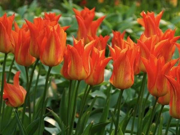 Тюльпан Ballerina (Балерина). Лилиецветный. Бокал высокий, до 10 см, ярко-оранжевый. Цветок ароматный. Высота до 50 см. Отличная срезка. Великолепно сочетается с тюльпаном Burgundy (Бургунди).