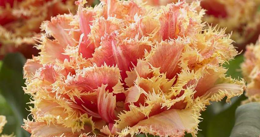 Тюльпан Brisban (Брисбен). Густобахромчатый, кораллово-красный с желтой бахромой, высота растения 35 см.
