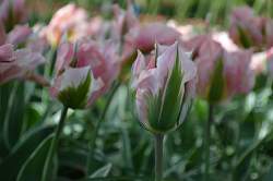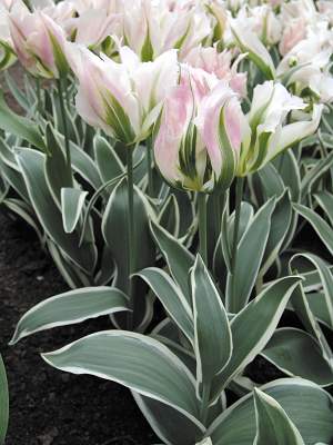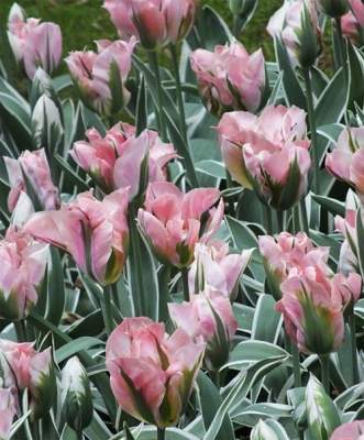 Тюльпан China Town (Чайна Таун). Изысканный бокал с волнистыми лепестками. Основной тон нежно-розовый, зеленое пламя, желтые штрихи. Листья вариегатные, с белой аккуратной каймой. Высота 50 см.