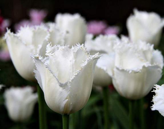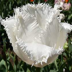 Тюльпан Daytona (Дэйтона). Изящный белоснежный бокал с изысканной длинной бахромой. Листья темно-зеленые, однотонные. Высота растения 35-50 см. Цветет в апреле-мае. Цветок крупный, белоснежный, с крупными снежно-белыми, игольчато-бахромчатыми лепестками.