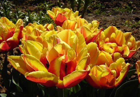 Тюльпан Double Focus (Дабл Фокус). Пламенеющий, ярко-красный у основания с желтой каймой, махровый.