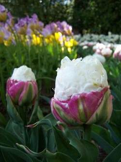 Тюльпан Double Polar (Дабл Полар). По-настоящему роскошный густомахровый поздний тюльпан. Цветет очень долго. Прекрасен на всех стадиях — от бутона до полностью раскрывшегося цвета. Бокал в полуроспуске двухцветный: будто на малиновой чашечке затейливо уложен десерт из белоснежных взбитых сливок или мороженого.