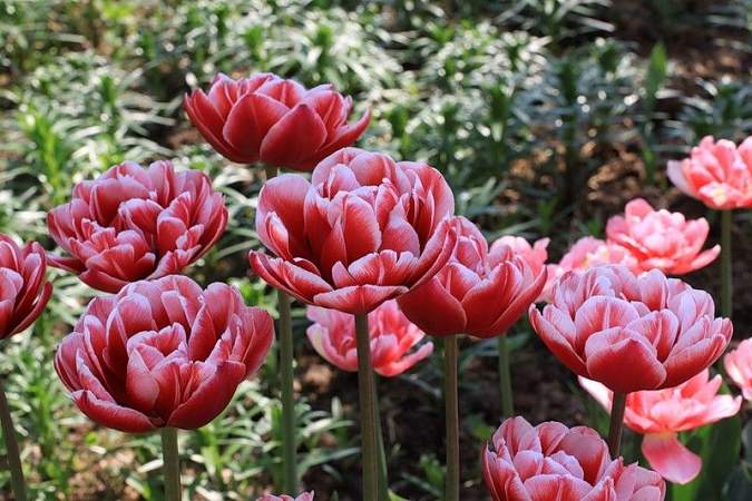 Тюльпан Drumline (Драмлайн). Махровый поздний. Пионовидный. Лепестки красные с белой неравномерной каймой.