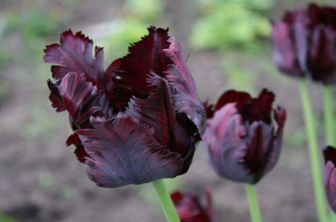 Тюльпан Frozen Night (Фрозен Найт). Очень эффектный, листья как перья, окраска бордово-черная. Бокал крупный. Высота растения 50 см.