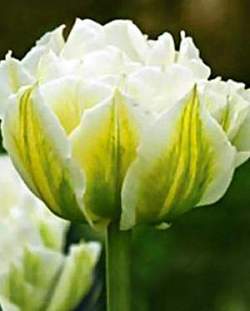 Тюльпан Global Desire (Глобал Дизае). Махровый ранний. Очень крупный белый махровый тюльпан. В полуроспуске крайние лепестки с красивым желто-зеленым "пламенем". Высота 40 см. Долго стоит в срезке.