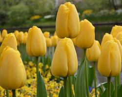 Тюльпан Golden Parade (Голден Парад). Цветет в начале мая, образуя высокий, 10 см, насыщенно-желтый бутон. Красивый цветок возвышается на прочной ноге высотой до 60 см. Форма цветка классическая. Сорт легко размножается, прекрасно подходит для выгонки. Лучшая срезка!