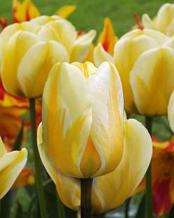 Тюльпан Jaap Groot (Яп Гроот). Очень крупный классический бокал (11 см). Тюльпан видный, обращающий на себя внимание. По кремово-белому фону идут желтые всполохи. Нарядный сорт для срезки и украшения весенних цветников. Очень привлекателен, когда полностью раскрывается.
