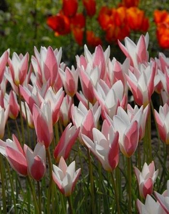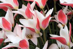 Тюльпан ботанический Lady Jane (Леди Джейн). Внешняя сторона лепестков розовая, внутренняя почти белая, на белом фоне красиво выделяются пыльники цвета корицы. Листья тонкие. Высота растения 15 см. Не нужно выкапывать. Цветение очень раннее. Идеальное раннее луковичное растение для гравийных садов, высадки вдоль дорожек, а также куртинами на газоне.