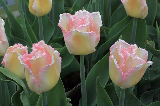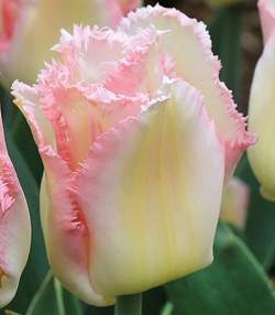 Тюльпан Lingerie (Линжери). Цветок очень свежей и необычной окраски. Белый с желтой спинкой и ярко-розовой бахромчатой каймой. Поздний. Высота 45 см.