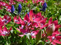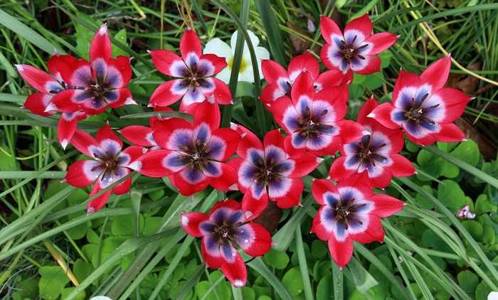 Тюльпан ботанический Little Beauty (Литл Бьюти). Цветок малиновый с фиолетовой звездой. Высота растения 15 см. Не нужно выкапывать. Цветение очень раннее. Идеальное раннее луковичное растение для гравийных садов, высадки вдоль дорожек, а также куртинами на газоне.