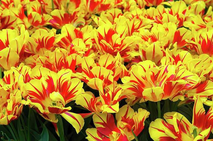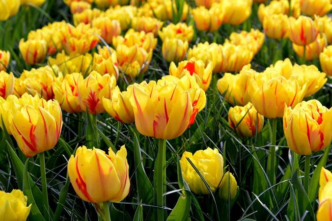 Тюльпан Monsella (Монселла). Махровый, ранний. Зацветает в конце апреля. Цветки насыщенно-желтые с яркими красными языками. Цветки крупные (диаметр цветка не менее 10 см), красивой пионовидной формы. Высота 30-35 см.