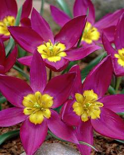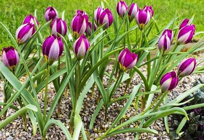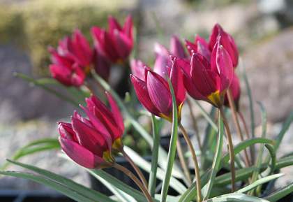 Тюльпан ботанический Odalisque (Одалиска) — растение до 15 см высотой, стебель прямостоячий, гладкий. Листья узкие, сизо-зеленые. Бокал темно-вишневый, раскрывается в крупную звезду с желтым дном. Чудесный ранний тюльпан, который не нужно выкапывать.