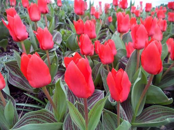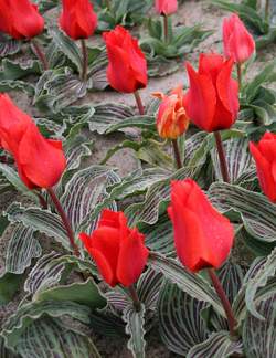 Тюльпан Oriental Beauty (Ориентал Бьюти). Бокалы красные. Цветоносы пурпурные. Листья сизые в пурпурных штрихах и полосках. Можно не выкапывать 2-3 года.