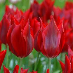 Тюльпан Pieter de Leur (Питер де Лёр). Этот тюльпан — звезда весеннего сада. Окраска цветка сочно-красная, внешние лепестки с более темным бархатным напылением. Высота 50 см. Отлично стоят в срезке.