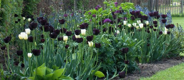 Тюльпан Queen of Night (Квин оф Найт). Бокал высокий, классический. Цвет потрясающий — глубоко-бордовый, почти черный. Меняет окраску в зависимости от освещения. Порой выглядит как инфернально-фиолетовый. Лепестки с атласным блеском. Высота растения 40 см. Отличный сорт для срезки.