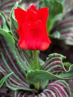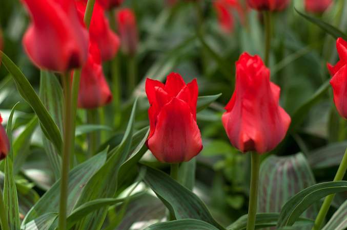 Тюльпан Red Riding Hood (Ред Райдинг Худ). Ярко-красный бокал, листья с фиолетовыми полосками. Можно не выкапывать два-три года.