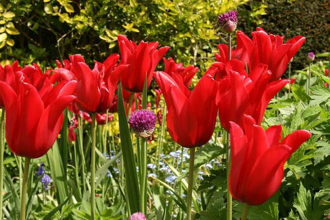 Тюльпан Red Shine (Ред Шайн). Блестящие шелковистые лепестки яркого алого цвета. Крупные изящные бокалы. Продолжительность цветения 2-3 недели. Великолепный компаньон для сортов в сиреневой и пурпурной гамме.