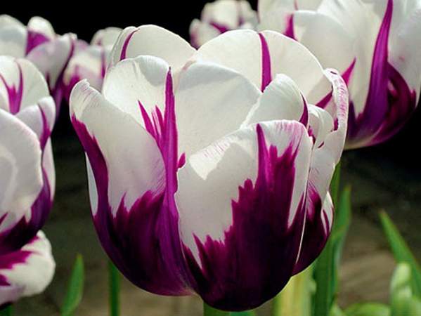 Тюльпан Rem's Favorite (Рэмс Фейворит). Триумф. Бесподобный тюльпан — высокий, с крупным бокалом. Яркий контраст темно-лилового с белым. Элегантность цветка подчеркивает пурпурный цветонос.