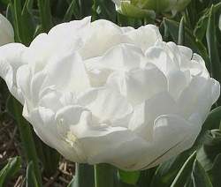 Тюльпан Up White (Ап Вайт). Поздний. Цветок крупный, очень красивый, махровый, пионовидный. Высота растения 45 см. Долго цветет и отлично стоит в вазе.