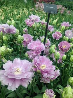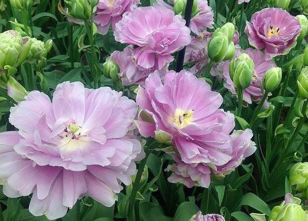 Тюльпан Violet Prana (Вайелет Прана). Махровый многоцветковый тюльпан, который раскрывается в огромные "тарелки". Бутоны совершенно зеленые, затем, по мере роспуска форма бокала становится похожа на зеленую чашечку, набитую сиреневыми кружевами. Цвет невозможно описать, недаром он называется Лиловая Прана. Цветение очень продолжительное. Эксклюзивный сорт.