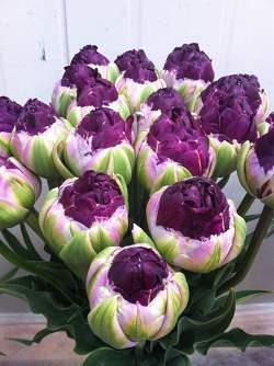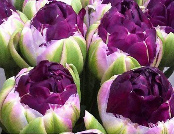 Тюльпан Wow (Вау). Цветок крупный, до 12 см в диаметре, махровый. Окраска пурпурная. Внешние лепестки зеленые с кремово-розовым. В полуроспуске смотрится необычно, как корзинка с лесными ягодами. В полном роспуске полностью пурпурный. Высота 40 см.