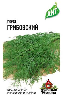 Укроп Грибовский. Раннеспелый (от всходов до уборки на зелень 30 — 45 дней, до уборки на специи — 55-70 дней) сорт для выращивания в открытом и защищенном грунте на зелень и специи (схема посева: 5х20 см и 15х20 см соответственно). Розетка листьев прямостоячая. Листья крупные, сильнорассеченные, темно-зеленые с сизым оттенком, сочные, очень ароматные. Соцветия слабовыпуклые и выпуклые, диаметром 18-30 см. Масса растения в технической спелости 30 г. Вкусовые качества хорошие. Выращивают прямым посевом в открытый грунт на глубину 1-2 см. Урожайность 1 кг/м2. Сорт относительно устойчив к болезням. Рекомендуется для использования в свежем виде, замораживания и консервирования.