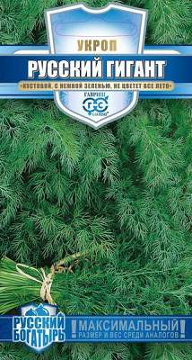 Укроп Русский гигант. Уникальный сорт кустового укропа с крупными листьями и густой розеткой. При уборке урожая из одного растения получается целый пучок нежной ароматной зелени. Очень долго не цветет, что позволяет все лето собирать свежую зелень практически без повторных посевов. Благодаря приподнятой розетке листья не загрязняется во время дождей и их легко убирать. Масса одного растения при уборке на зелень до 150 г, при уборке на специи — 220 г. Посев семян в грунт производится в конце апреля — начале мая. Сорт можно выращивать через рассаду, чтобы получить урожай уже во второй половине мая.