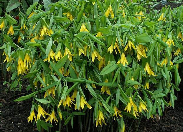 Увулярия Grandiflora (Грандифлора). При цветении желтые цветы делают ярким самый тенистый уголок участка. После прекращения цветения мощный куст из прямых стеблей не теряет своей привлекательности. Листья слабоопушенные и многочисленные. Кусты увулярии прекрасно чувствуют себя на одном месте на протяжении многих лет. Чем старше куст, тем он более красив.