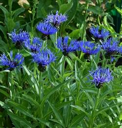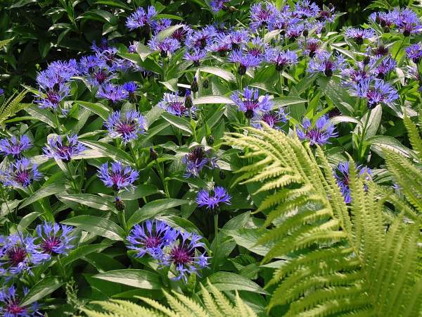 Василек горный. Милейшее неприхотливое растение, способное расти даже в тени, но лучше развивается на солнце, имеет более компактный куст. Куст округлой формы, стабильно декоративен весь сезон, но особенно красив в период цветения.