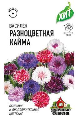Василек Разноцветная кайма синий (смесь) DHп. Великолепная смесь невысоких сортов для оформления объемных бордюров, нарядных цветников. Растения сильноветвистые, высотой 40 см. Цветение обильное и продолжительное. Соцветия махровые самой разнообразной окраски, 4-5 см в диаметре. Растения светолюбивы, холодостойки, относительно засухоустойчивы, к почве нетребовательны, но не любят переувлажнения. Для большей кустистости растения прищипывают. Многочисленные соцветия используют для небольших подарочных букетов.