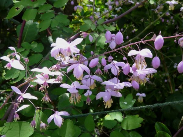 Василистник Anne (Анна). Высокий многолетник с красивой голубоватой резной листвой, темными стеблями и огромными воздушными соцветиями, состоящими из мелких желто-лиловых филигранных цветков — бутоны ярко лиловые, лепестки сиреневые, а тычинки кремово-желтоватые. Весной листья красиво окрашены в пурпурно-фиолетовые оттенки.