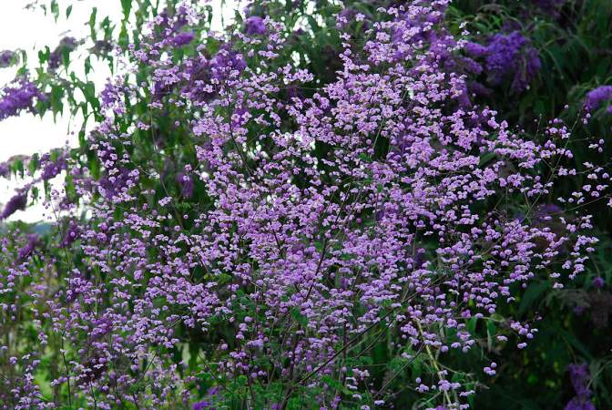 Василистник Splendide (Сплендид). Изящный многолетник с кружевной листвой, во время цветения образует облако из лавандово-розовых многочисленных мелких стерильных цветков. Отлично подходит для срезки. Растение высотой 120-150 см, требует подвязывания, если растет одиночно. Цветоносы тёмные.