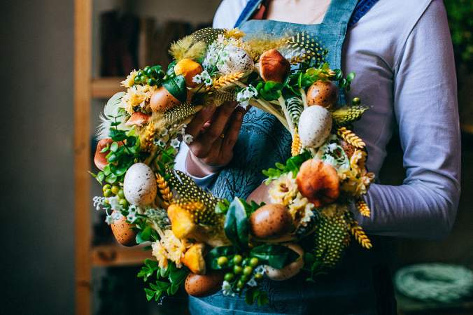 Этот венок — поистине универсальное изделие. Ведь и к Пасхе вместе с детьми можно сделать отличные украшения. Разнообразные перышки, шоколадные или искусственные яйца, фигурки ангелов, ленты прикрепляются к основе... И вот неповторимый и радостный венок готов! Также из него можно сделать своего рода гнездышко: украсить венок и поставить внутрь миску с куличом или яйцами. Такого не будет ни у кого, только у вас.
