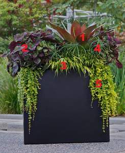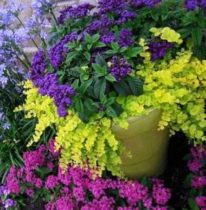Поскольку вербейник стремительно разрастается и быстро укореняется, с ним можно составлять самые невероятные композиции, даже с комнатными растениями.