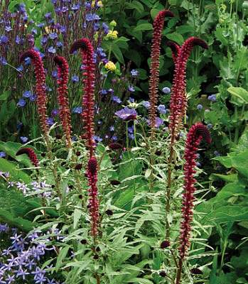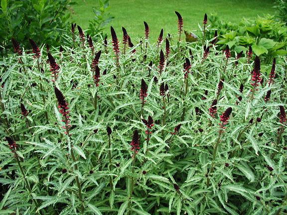 Вербейник пурпурный Beaujolais (Божоле). Высота 50 см, куст 45-60 см в диаметре. Восхитительный сорт с колосьями винно-красных, почти черных цветков, резко контрастирующих с серебристо-зелеными ланцетными листьями. Интересна и лёгкая гофрировка по краю листа, особенно заметная у молодых листьев. Цветет с июля по август.