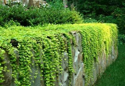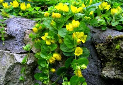 Вербейник монетчатый. Многолетнее травянистое растение со стелющимися стеблями и желтыми цветками в пазухах листьев. Цветет с июня по август. На солнце цветение обильное, за цветками не видно листьев. Вербейник хорошо растет и на солнце и в тени и в полутени. Растение почвопокровное, плети раскидывает до 80 см. Отлично смотрится на вертикальных каменистых склонах. Разрастается быстро, но контролировать рост очень легко. Любит влажную почву, ухода не требует.