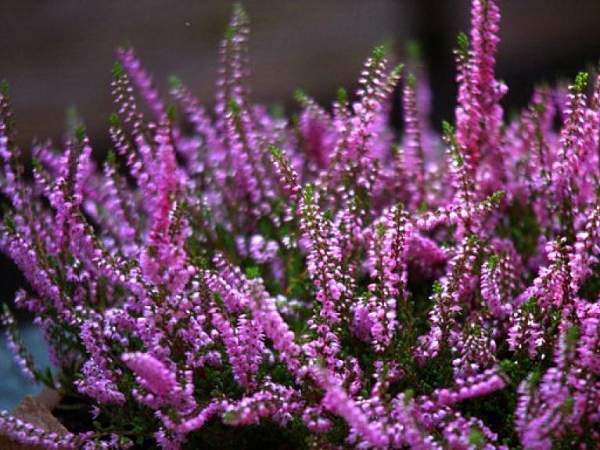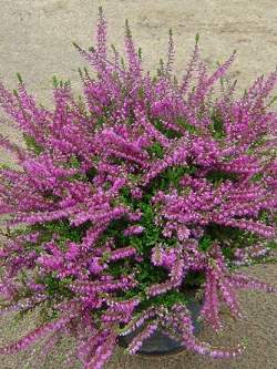 Вереск Carmen (Кармен). Кустарник высотой и шириной 30-40 см, плотный, подушковидный. Побеги длинные прямые. Листья маленькие, тёмно-зелёные. Цветки розово-фиолетовые (сиреневые), собраны в длинные густые соцветия.