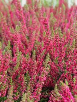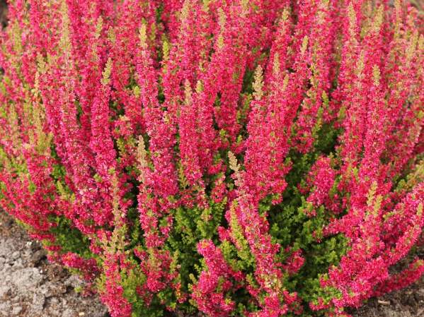 Вереск Disco Queen (Диско Квин). Низкорослый многолетний кустарник, с плотной шаровидной кроной. К августу наступает пора цветения и темно-зеленые мелкие игольчатые листья уходят на второй план. Открываются многочисленные и довольно крупные, махровые цветы. Соцветие до 15 см. Цвет насыщенный — от малинового до пурпурно-красного. Продолжает цвести до конца октября.