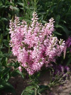 Вероника Pink Explosion (Пинк Эксплоужен). В отличие от серии Bomb, сорта Explosion имеют достаточно длинные метельчатые соцветия, состоящие из множества колосков. У сорта Pink Explosion они светло-розовые, изящные. Высота растения 45 см. Куст разрастается до 40 см. Подходит для срезки. Очень привлекательна для пчел. Цветение со второй половины июня, продолжительное.