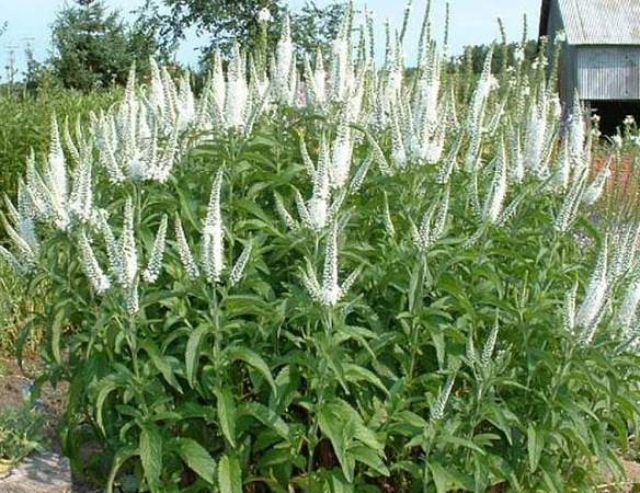 Вероника колосковая Schneeriesin (Шнееризин). Один из самых высоких сортов вероники, 60-80 см. Куст прямостоячий, с зелеными, удлиненно-овальными ланцетными листьями, собранными в мутовки. Цветение очень продолжительное, с июля по август, длинными кистевидными разветвленными соцветиями.