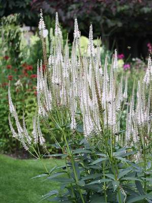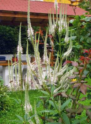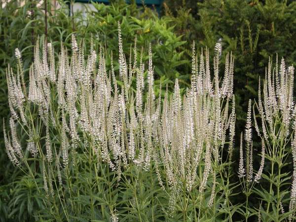 Вероникаструм Diana (Диана). Один из лучших сортов вероникаструма. Соцветия длинные, разветвленные, белого цвета. Высота около 130 см. Цветет с июня по август. Прекрасно вписывается в ландшафт натуралистического стиля.