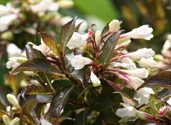 Вейгела Black and White (Блэк энд Вайт). Первая карликовая вейгела с пурпурным листом и белыми цветками. Куст высотой 30-40 см, шириной до 80 см. Цветет в мае-июле.