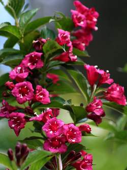 Вейгела Bristol Ruby (Бристол Руби). Куст вырастает до трех метров в высоту. Крона раскидистая — 3-3,5 метров диаметром, стебли прямые, длинные. Листья ярко-зеленые, с зубчатыми краями, без прилистников. Зимние почки имеют по несколько остроконечных чешуек. Куст не сбрасывает листья до поздней осени, что повышает его привлекательность и декоративность.