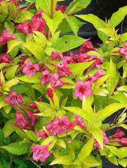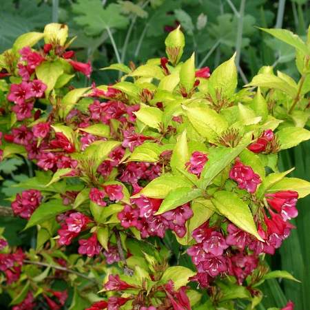 Вейгела Golden Jeans (Джинс Голд). Изящный, листопадный, красиво цветущий кустарник. Растет медленно. Листья желто-зеленые, продолговатые, немного заостренные. Насыщенные и яркие розовые колокольчатые цветы, собранные в небольшие соцветия. Цветение вейгелы проходит в два этапа. Первое, очень обильное, в июне и июле, а повторное, почти незаметное, в начале осени.