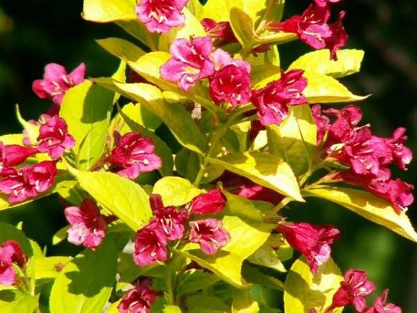Вейгела Looymansii Aurea (Лойманса Ауреа). Невысокий кустарник с раскидистой формой кроны. Высота 1 м, ширина кроны до 1,5 м. Листья в период отрастания и до начала лета бледно-желтые, затем зеленеют. Цветы розовые, собраны в кисти. Эту вейгелу лучше посадить в легкую полутень.