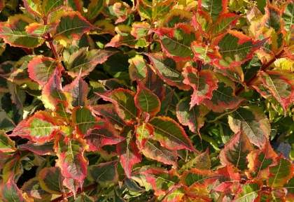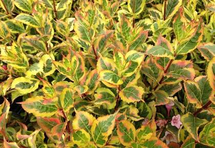 Вейгела цветущая Magical Rainbow (Мэджикал Рэйнбоу). Декоративный компактный кустарник высотой 100 см, шириной 150 см, листья оригинальные, зелёные с широкой жёлтой каймой, на ярком солнце кайма постепенно становится красно-оранжевой. Листья не подгорают на солнце, сохраняют пестроту в течение сезона и создают красивый контраст с красными побегами, цветки бледно-розовые, стерильные. Цветение обильное в июне.