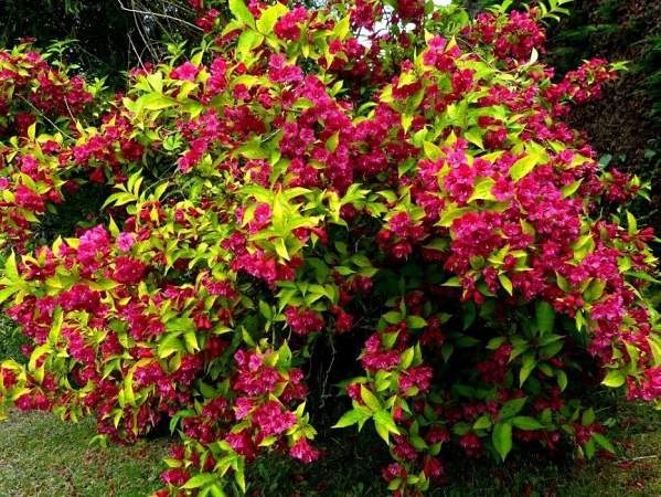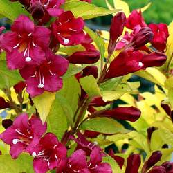 Вейгела Olympiade (Олимпиада). Крупные светло-рубиновые цветы. Фантастический контраст с блестящей желтой листвой. На солнце желтый цвет усиливается. Высота и ширина 1,5-2 м. Рекомендуется обрезка, которая будет способствовать более сильному цветению. Обрезают не более, чем на треть длины побегов.
