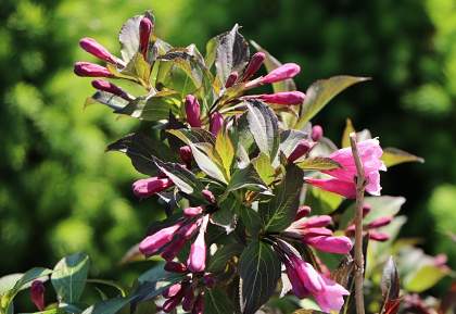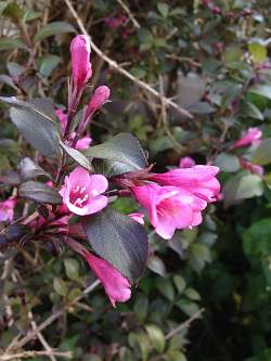 Вейгела цветущая Purpurea (Пурпуреа). Обильноцветущий кустарник высотой до 1 м с буровато-красными листьями, не меняющими окраску на протяжении всего вегетационного периода, цветки тёмно-розовые, трубчатые, цветёт в конце мая-начале июня.