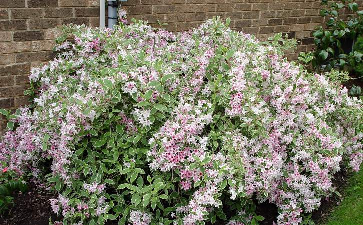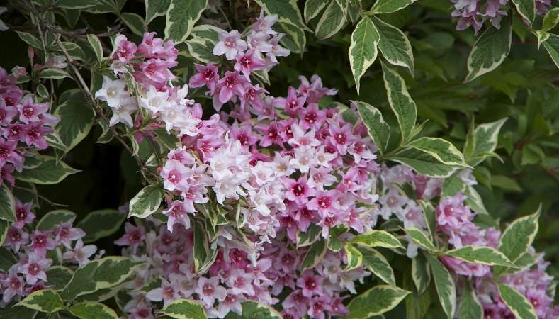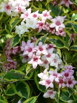 Цветки светло-розовые, нежного оттенка, у лепестков есть обрамление более интенсивного тона. Вейгела формирует соцветия из 3-7 удлиненных колокольчиков. Куст радует еще и тонким благоуханием. Обильное весенне-летнее цветение после соответствующей обрезки сменяется осенним, которое начинается с конца августа и длится весь сентябрь.