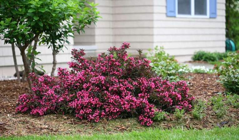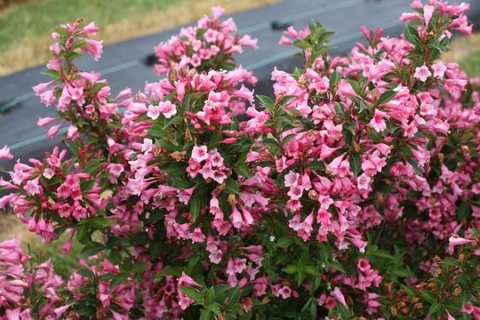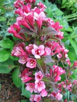 Вейгела Tango (Танго). Компактный сорт канадской селекции низкорослой вейгелы с раскидистой, округлой формой кроны, высотой 80 — 100 см. Один из самых эффектных представителей своего рода, впечатляет зелёно-пурпурной листвой и яркими розовыми колокольчатыми цветами. цветёт в июне-июле. Повторное цветение в августе и сентябре.